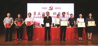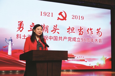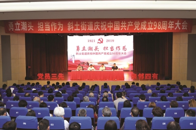 6月27日上午,斜土社区文化活动中心礼堂气氛热烈庄重。斜土街道召开“勇立潮头,担当作为”庆祝中国共产党成立98周年大会。街道党工委书记章红兵出席大会并讲话,街道党工委副书记、办事处主任王万金主持会议。 街道党政领导班子成员,街道2019年区优秀共产党员、区优秀党务工作者、区先进基层党组织负责人,街道机关及各中心党员,区域单位党员代表,居民区和两新党组织书记、委员等320人出席大会。 章红兵同志代表街道党工委,向受到表彰的2019年区优秀共产党员、区优秀党务工作者和区先进基层党组织表示祝贺,向辛勤工作在街道各条战线上的广大党员和党务工作者,向参与和支持斜土改革发展的区域单位党组织和党员,致以节日的问候和衷心的感谢。 会议强调,一是要不忘初心,深入抓好党建这个最大政绩,推动斜土党的建设全面提升。不忘党的创业维艰,以历史视野提升站位格局。铭记党的奋斗情怀,以政治信仰提升治理格局。弘扬党的改革精神,以改革担当提升党建格局。二是要牢记使命,紧紧扭住发展这个第一要务,聚焦中心大局抓党建。把“四个放在”作为一切工作的基点,在服务战略大局中推动徐汇一流中心城区和斜土城市水岸、亲邻社区建设。发挥党建优势优化营商环境。凝聚党建合力助推“一号工程”。坚持党建引领激发社会治理创新活力。三是要奋勇争先,着力做实凝聚这个首要力量,推动城市基层党建高质量发展。以组织力建设为抓手,突出党组织和党员的作用发挥,推动各领域党建提质增效。以完善机制为重点,强化沟通联系,提升发展共识和促进力量凝聚。以“共同工程”为载体,合作共赢持续推动,打造社区共同体。努力以一流党建引领一流发展。 会上,对斜土街道获评2019年区优秀共产党员、区优秀党务工作者、区先进基层党组织进行了表彰。 主题会议结束后,来自街道机关、事业、居民区相关同志组成的宣讲团深情讲述三位优秀党员的事迹。优秀党员张盛祥:恪尽职守替党分忧,扎根基层为民服务。优秀党员韩东萌:坚持党建引领居民自治的践行者。优秀党员孝作峰:依托“党员三先”,当好“两新”党组织的好班长。 由部分社工和居民区干部倾情演绎的《垃圾的重量》、《大医精诚——社区居民的健康卫士》两堂情景党课,生动诠释了斜土社区共产党人的初心和使命。 最后,全体党员在领誓人街道党工委书记章红兵的带领下,现场重温入党誓词。大会在雄壮的《国际歌》中胜利闭幕。