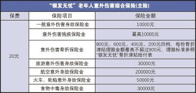 2020年5月6日起,“银发无忧”老年人意外伤害综合保险再次火热开售。该保险由上海市养老服务发展中心联合保险公司于2005年起推出,每年定期销售。2020年的销售期为5月6日-6月15日,届时可至所在地的居(村)委会或相关涉老组织购买。该保险对本市50周岁以上的老年人群体,年龄上不封顶。保险投保范围广,凡上海本地或常住居民、年满50周岁以上或持有符合国家规定的退休证,且生活可自理、无精神类疾病、无智力障碍者,均可在各居(村)委会以及相关涉老组织购买,主险和附加险均为20元/份,50至80周岁(含)老年人主险最高可购买10份,81周岁及以上老年人主险最高可购买3份。保险期限为2020年7月1日0时-2021年6月30日24时。今年,在优化了骨折理赔标准、大幅提高旅游意外、食物中毒身故及医疗责任保额的基础上,结合全国抗击新型冠状病毒疫情的形势,在“银发无忧”原方案基础上,免费拓展了因新型冠状病毒肺炎导致的身故和全残。 来自新华保险上海分公司的数据显示,截至2019年底,累计投保“银发无忧”保险的老年人已超过900万人次。今年的“银发无忧”保险,除新华保险上海分公司外,太平洋人寿也将共同参与。太平洋人寿负责浦东新区、金山区和松江区的投保工作,全市其他13个区由新华保险上海分公司负责。