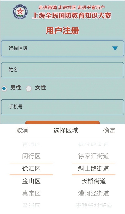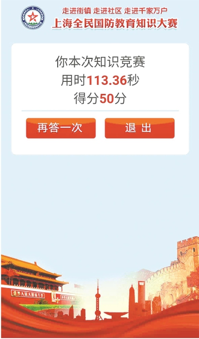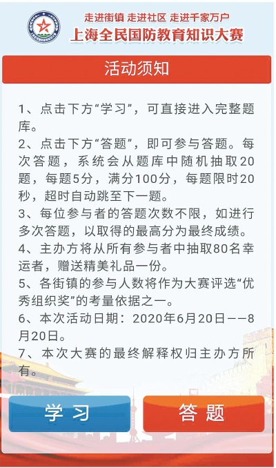 2019年12月,上海“全民国防教育知识大赛暨红色故事会”在上海报业大厦正式拉开序幕。本次大赛以“赞辉煌 爱国防同筑梦”为主题,旨在通过国防教育下沉至社区,走进百姓、走进千家万户,让广大市民对国防知识有更直观、更深入的了解,提高全民的国防观念,促进爱国主义教育和国防教育在社区的覆盖和延伸,营造拥军优属的良好氛围,使全民国防教育工作更上一层楼,探索、打造全民国防教育新模式、新路子。 ■市民参赛 市民可通过网上答题小程序参与答题,答题时间从6月20日开始,至8月20日截止。届时主办方将从所有参与答题活动的市民中抽取80名幸运者,赠送精美礼品一份。 ■如何参赛 扫描图中二维码,登录APP小程序。在注册界面输入姓名、手机号,选取徐汇区斜土街道,点击提交完成注册。返回大赛界面,点击登录进入答题页面,点击学习可以练习答题,点击答题直接开始答题,答题一共20题,单项选择,每题答题时长20秒,完成答题,出现该界面,可选择退出或重新答题。