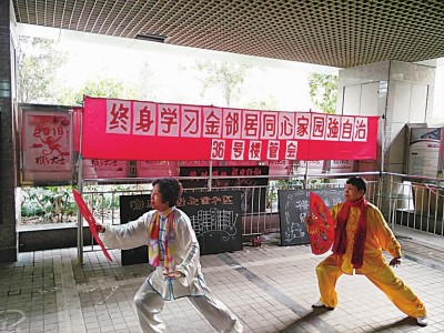 □通讯员 汤云 3月20日,在远景路97弄36号楼前,举行了“终身学习金邻居、同心家园强自治”的交流展示活动,共有50余位居民参加了活动。 活动由楼管会策划筹备组织,由楼组居民主持,由终身学习小组成员及楼组的居民们参与表演,真正做到了居民自治。节目精彩纷呈,有小朋友的吉他演奏、萨克斯独奏,有退休阿姨们的“中华韵律操”、“中国功夫扇”,还有家庭合唱《我相信》。36号金邻居学习小组负责人罗志勇表演了脱口秀“退休后做自己喜欢做的事情”,尤其讲到自己加入自行车队后,从新疆骑到嘉裕关,从北京骑到杭州,并把自己的骑车装备展示给大家时,现场响起了热烈的掌声。终身学习推进员谭师傅热爱拳脚功夫,表演了中华气功操,也引来大家连声赞叹。 节目众多,一个半小时大家还觉得意犹未尽,同时也让居民们大开限界,“原来自己楼里还真的是藏龙卧虎啊!”大家在相互感叹的同时,也相互交流,相互熟悉起来,一派和和睦睦,其乐融融的景象。大家要做“金邻居”,传播正能量,36号楼组“同心家园”建设迈开了一大步。