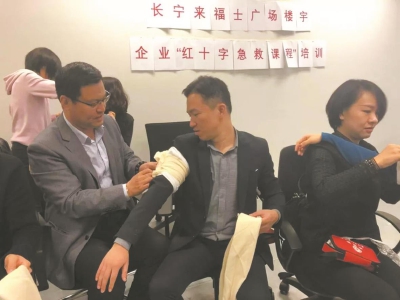 为提高楼宇白领在突发事件中的自救互救能力,弘扬“人道、博爱、奉献”的红十字精神和普及应急救护知识,11月27日、28日,周家桥街道联手区红十字会在来福士党建服务站开展了为期两天的楼宇企业“红十字急救课程”培训。本次课程特邀区卫生学校7位老师为楼宇企业白领授课。 本次培训是街道楼宇党建服务项目“荟聚”系列之“荟健康”活动之一,主要针对来福士广场物业公司和楼宇企业白领,共65人参加了培训。他们在这两天中,进行了十项内容的理论课与实践课学习,并针对所学内容进行实践考核,达到标准的学员可取得红十字会应急救援证书。 课间,白领们仿佛又回到了快乐的学生时代,他们全神贯注、聚精会神的听着老师讲课,认真做着笔记,大家对如何使用纱布、三角巾、绷带;如何包扎伤口、急救的要点;如何有效施救等多方面进行了较系统的理论学习。 本次培训所学内容不仅让各位学员了解到应急救护知识,在今后遇到突发事件可以进行及时、正确的处理,还掌握了基本急救技能,这是平日生活中所必须掌握的技能。无论在学习、生活中遇到突发情况,都可以及时伸出援助之手,给予人帮助。