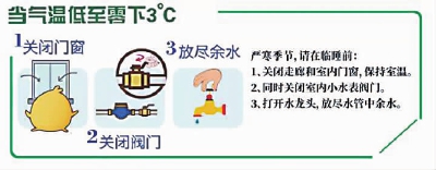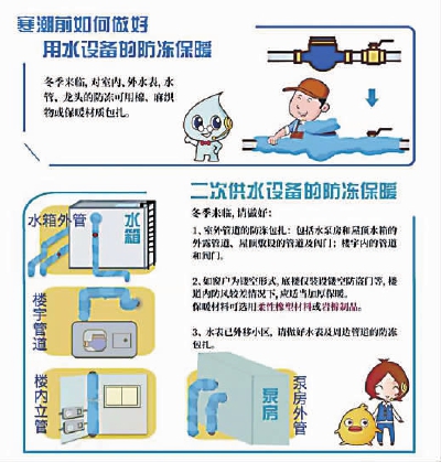 城投水务集团说,为应对寒潮,已对进行过二次供水接管改造的近6100个小区全面检查了管道防冻包扎,对保温层有脱落、损坏的及时整改包扎。同时,也呼吁广大市民了解水管防冻保暖小常识,做好家中自我排查与防护工作。