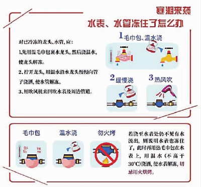 如发现漏水,水管冻裂,请及时联系所属物业查核;如二次供水已接管改造小区发生以上情况,或发现水表冻坏,请拨打上海供水热线962740报修。