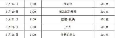 参与方式:长宁路1488弄502室前台报名,请提供姓名和联系方式。名额有限,额满即止! 咨询电话:52737013*8063 预约时间:早上9:00~11:00;下午2:00~4:00 注意事项:观影全程请佩戴口罩 《找到你》 由吕乐执导,冯小刚监制的剧情电影,由姚晨、马伊琍领衔主演,袁文康、吴昊宸联合主演。该片讲述了职场律师李捷被保姆孙芳“偷”走了孩子,为了追寻孩子下落,两位生活处境完全不同的女人就此展开一场命运博弈的故事。 《菊次郎的夏天》 由日本北野武工作室制作的121分钟喜剧电影。该片由北野武执导,北野武、关口雄介、岸本加世子等主演。该片讲述的是小男孩正男和隔壁的叔叔菊次郎在暑假冒险旅程的途中发生了一系列搞笑又让人落泪的故事。 《催眠·裁决》 由黎兆钧、施柏林、刘永泰执导并编剧的犯罪动作电影,由张家辉、张翰领衔主演。该片主要讲述了陪审团成员许立生,被匪徒以女儿性命作威胁,要求他在90分钟内催眠至少4个陪审团成员来操控审判结果、摧毁真相的故事。 《天火》 由原著《石龙坝》改编而来,讲述的是1908年滇越铁路修到昆明,法国殖民主义者准备在昆明修建水电站,中国地方官员柳呈光和爱国人士左煜轩、沈仲达等人与殖民主义者展开斗争的故事。 《愤怒的拳头》 该片讲述一个草根拳手如何摆脱困境,在人生的低谷如何寻找自我人生价值的故事,影片深刻挖掘了人性,摆脱了以往动作影片的格调,是一部商业与艺术相结合的影片。