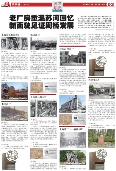 新中国成立后,周家桥地区经历了天翻地覆的变化,在诸多优秀民族工商业者的带领下,各类工厂拔地而起,棉纺织厂、织布厂、橡胶厂、电器厂、化工厂……工业在周家桥地区生根发芽,逐渐改变了人民的生活,各类产品的出口更是带来了一波经济红利。如今,那些曾在周家桥苏河沿岸、道路上的工厂已不复存在,变成了如今高楼林立的景象。那个时代已经过去,但周家桥工业发展的历史值得铭记。 上海第五棉纺织厂 【忆往昔】 上海第五棉纺织厂占地面积3.25万平方米,固定资产4904万元,职工3562人。属国家二级企业。前身是日商丰田佑吉开设的丰田纱厂,建于民国8年(1919年)。该厂创造出一整套纺制针织用纱的独特工艺,产品畅销国内外。1978年,获市纺织工业局“产品信得过工厂”称号。1979年,其“丰收牌”精梳针织纱获国家质量金奖。本世纪初,厂区建起了“大家源新城”高层住宅小区。所幸保留了西侧的棉花仓库,现在被开发成“创邑·河”创意产业园。 【一街一品】 在“创邑·河”创意产业园设立“上海第五棉纺织厂”铭牌,让更多人了解这个地方的前生今世。 丰田纱厂 【忆往昔】 1919年,日本丰田纱厂在上海建立,中国抗战和解放战争时期,日本纱厂内的日本左翼革命者曾掩护中国共产党地下组织人员,为中国的革命胜利做出了贡献。1945年,上海丰田纺织工厂由国民党中国纺织建设公司接管,改名为中国纺织建设公司上海第一机械厂。新中国成立后,1950年工厂改建为国营上海第一纺织机械厂,也是周家桥街道管辖区当中第一个建立红色党支部的。2007年重组为上海第一纺织机械有限公司。 【一街一品】 在上海第一纺织机械有限公司设立“丰田纱厂”铭牌,让更多人了解这里的历史故事。 强家渡口 【忆往昔】 1997年12月16日上午8时许,横跨苏州河的强家角桥建成启用,一个多小时之后,沪航客107号客轮从苏州河北岸缓缓驶向南岸码头,完成了最后一渡,自此,苏州河市区段渡船历史彻底结束,强家角渡——苏州河上的最后一个渡口,也退出了历史的舞台。 强家角渡,位于长宁区西部周家桥地区,这是一个典型的上海渡口,经历了从传统义渡到国营摆渡的变化,但强家角渡又不止于此,她初建于清末,终于20世纪末,时间跨度长达百年,强家角渡见证了苏州河和上海的变迁,也是城市发展的小小缩影。 【一街一品】 在强家渡口设立“强家渡口”铭牌,带领大家了解它的过往。 上海第八煤球厂 【忆往昔】 位于苏州河畔的DOHO创意产业园,在2005年前为上海第八煤球厂,占地面积4884平方米。 2006年,万航渡路西侧进行旧屋改造,原本河岸两畔的矮平房、经过治理脏乱差的苏州河变身成为一位婀娜多姿的美娇娘。DOHO创意园的建立,更丰富了这方土地。“水”代表着智慧、财富、灵气。高楼林立、钢筋水泥丛中工作的人,通过全透明的观景电梯以及约3米宽的落地观景窗以及屋顶花园咖吧,一步步的将苏州河美景收入眼帘。 【一街一品】 在DOHO创意产业园设立“上海第八煤球厂”铭牌,重现过往老厂房景象。 【看今朝】 以龙之梦雅仕大厦、来福士广场、DOHO创意园为中心的楼宇园区党群(营商)服务站,通过楼宇园区之间资源共享、优势互补,共同服务区域内的白领。街道党工委积极依托街道、政府部门、企业、驻区单位、社会组织、群团组织六方面资源,聚焦“荟系列”主题,制定每月活动菜单,提供配送服务。以开展丰富多彩的活动为抓手,吸引楼宇园区党员、白领,为他们提供服务,进一步扩大党建工作覆盖面,为楼宇园区发展凝心聚力。 亚洲电焊条厂 【忆往昔】 赫赫有名的亚洲电焊条厂,自1998年起被空置废弃,最终在2004年7月得以重生。旧厂房本身是价值很低的物业,但价值是相对的,经过创意改建和文化渗透,使它们具备了独有的个性,在艺术的光环下迎来了新生。大楼设计策划邀请了曾策划过泰康路艺术街的吴梅森先生与著名油画家彭鸣亮先生担任。外观看似寻常却体现了奇特的创意,大楼为“户”,黄蓝色块勾勒出“非”字,从而暗藏“门扉”之义,创意之门正在向你召唤。 【一街一品】 在创意之门园区设立“亚洲电焊条厂”铭牌,展现周桥今昔变化。 上海第二十一棉纺织厂 【忆往昔】 上海第二十一棉纺织厂旧址位于长宁路1860号,占地面积11.06万平方米,职工7040人。民国4年11月,民族工商业者荣宗锦、荣德生创建申新纺织第一厂,民国18年,再建申新纺织第八厂。抗日战争胜利后收回,经修葺扩建,恢复生产。民国37年,拥有纱锭5.35万枚、布机889台,职工4000人。上海解放初,国家对其扶持,实行定货加工。 【一街一品】 在上棉二十一厂纺织女工雕塑旁设立“上海第二十一棉纺织厂”铭牌,更好地了解它的过往。 天原化工厂 【忆往昔】 上海天原化工厂是全民所有制国家大型一档企业,化工部重点骨干企业,隶属于上海市化学工业局,原厂址位于长宁区天山路500号。工厂占地249863平方米,建筑面积115803平方米。产品分6类,18个品种近80个规格,计有烧碱11万吨、聚氯乙烯树脂4万吨、盐酸7.6万吨、液氯3万吨、漂粉精8000吨等,年总产量达60万吨,前两种列入国家重点考核产品,漂粉精是主要出口产品。工厂设5个生产车间,2个辅助车间,116个生产班组,职工3475人。 【一街一品】 在吴蕴初雕塑旁设立“天原化工厂”铭牌,展现周桥工业发展历程。