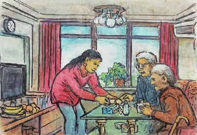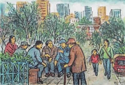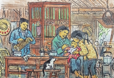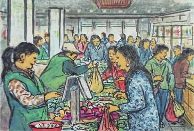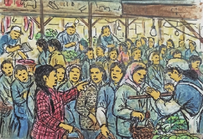 □绘图/配诗 蒋振国(光华坊居民92岁)撰文 张翠玲 科学家发现,在所有的感官记忆中,嗅觉是最难忘记的。视觉记忆可能会在几天甚至几个小时内消失,而产生气味和味道的东西可以让人们记住很长一段时间。 上世纪五六十年代,人们物质生活匮乏,蔬菜限斤买,想吃鸡鸭鱼肉一般家庭要等到逢年过节,平时都舍不得买荤菜。 蒋振国爷爷回忆道,早前育婴堂路上有一家菜市场,由于瓜果蔬菜肉类供应紧张,人们大清早就去排队买菜。清晨四五点开始,菜市场门口就有人声了。随着队伍越排越长,嘈杂声越来越大。遇上佳节,大排长龙,有的居民半夜就来排队了,用凳子占坐的现象时有发生。 牛奶和奶粉等高档营养品,在过去,对一般家庭来说是“吃不起”的高档货。那时候的婴儿,缺母乳就用米糊作为替代品。而今,营养品种类繁多,想买什么都买得到。 蒋振国爷爷说,现在生活条件好了,他早上喝送上门的鲜牛奶、吃鸡蛋,中午有芷江西社区的送餐员送餐上门,晚上用微波炉“叮”一下冰箱里的熟食,一天的生活就安排妥当了。 蒋振国爷爷的记忆中,巧克力是一种美味至极的甜品。每次参加婚宴庆典,他都会将喜糖带回来给家里的孩子们。现在孩子长大了,蒋爷爷的这个习惯依旧,将喜糖分享给亲朋好友或者社区里的孩子们吃。 与食物相关的记忆会被分散存储在大脑的各个感觉中心,被大脑的海马体所回忆。如果感觉刺激产生某种记忆,其他感觉器官感知和记忆的场景也会出现。