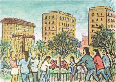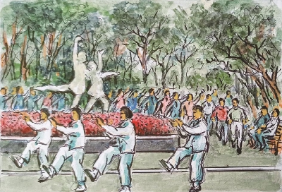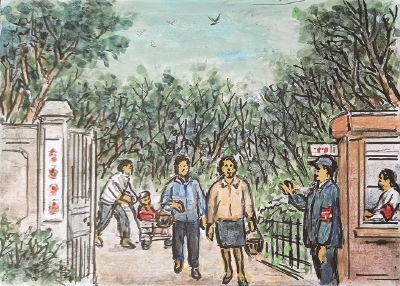 □绘图/配诗 蒋振国(光华坊居民92岁)撰文 张翠玲 “交通公园”原先是棚户区,习称“炒米浜”。 资料显示,在抗日战争中,“炒米浜”一带的棚户大多毁于敌军炮火。以后难民又陆续在此重建家园,但1953年一场大火再次把这里的棚户烧成灰烬。市人民政府决定易地安置灾民,将此地辟建为公园。1953年10月市工务局园场管理处造园科设计并组织施工,当年年底竣工。公园于1954年1月1日开放,不收门票。由于公园南墙外原是交通路,故定名为交通公园。笔者从苏家巷居委文化墙和居民提供的历史照片可以得知交通公园居民的一段过往。当年交通公园发生火灾,一部分受灾居民安置到芷江西路453弄地块,开启新生活,与原来的苏家巷住宅区融为一体。 为了建设地下防空工事,公园从1972年起关闭。在施工中,园内的道路、亭廊、儿童游乐设施和植物均受到不同程度的损坏。1977年开始进行公园的重建工作,由市园林处设计室章怡维负责总体规划,市园林处绿化工程队施工。工程于同年9月9日开始,重建园内道路、上下排水道、围墙、大门、厕所、拆除简易房,在原地基上建造休息间等。重建工程于1978年底完成,1979年1月1日公园重新开放。 公园大门西侧的休息廊为半廊,长30米,宽12.1米,砖木结构,小青瓦歇山顶,廊墙上有形状各异的漏窗。廊外有青石制作的圆桌、圆凳5组,两只花坛中散点湖石,植罗汉松、十大功劳和木香等花木。公园中部有翩翩起舞的两个少女雕塑,雕塑下为冬青大花坛,旁边还有3只略高一点的小花坛,坛内植月季、黄杨等。园西部有紫藤架,混合结构,长16.6米,宽6.5米,面积78平方米,地坪用彩色大理石碎片铺成。 如今,这方闹中取静的“城市绿肺”是芷江居民的“后花园”。 2003年,全新的交通公园居委会成立,由原熙安里、桥东、交通公园3个居委会合并而成。“炒米浜”于2009年开始动拆迁,2014年和源馨苑建成,新的交通公园居民区面貌焕然一新,小区都建有绿化带,配置了各种健身器材,居民在家门口健身很方便,幸福感和满意度也大大提高了。